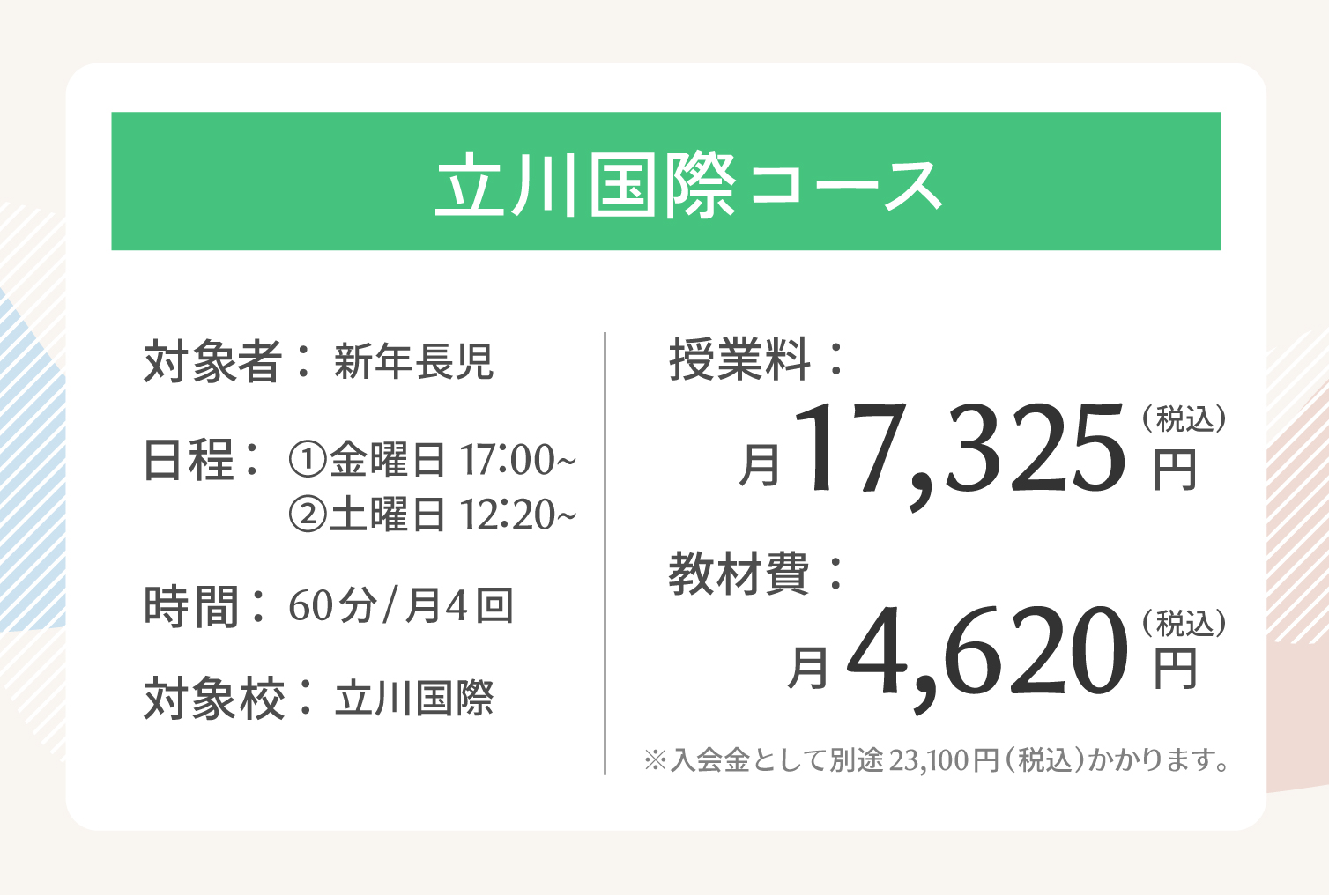 レッスン料は学齢と目的により決定されます。