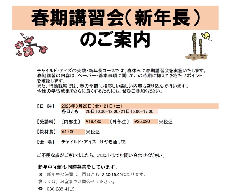 | 午後 | - | 個別対応 | 小学校受験(年長・年中) | 個別対応 | 個別対応 | 小学校受験 (年長・年中) |